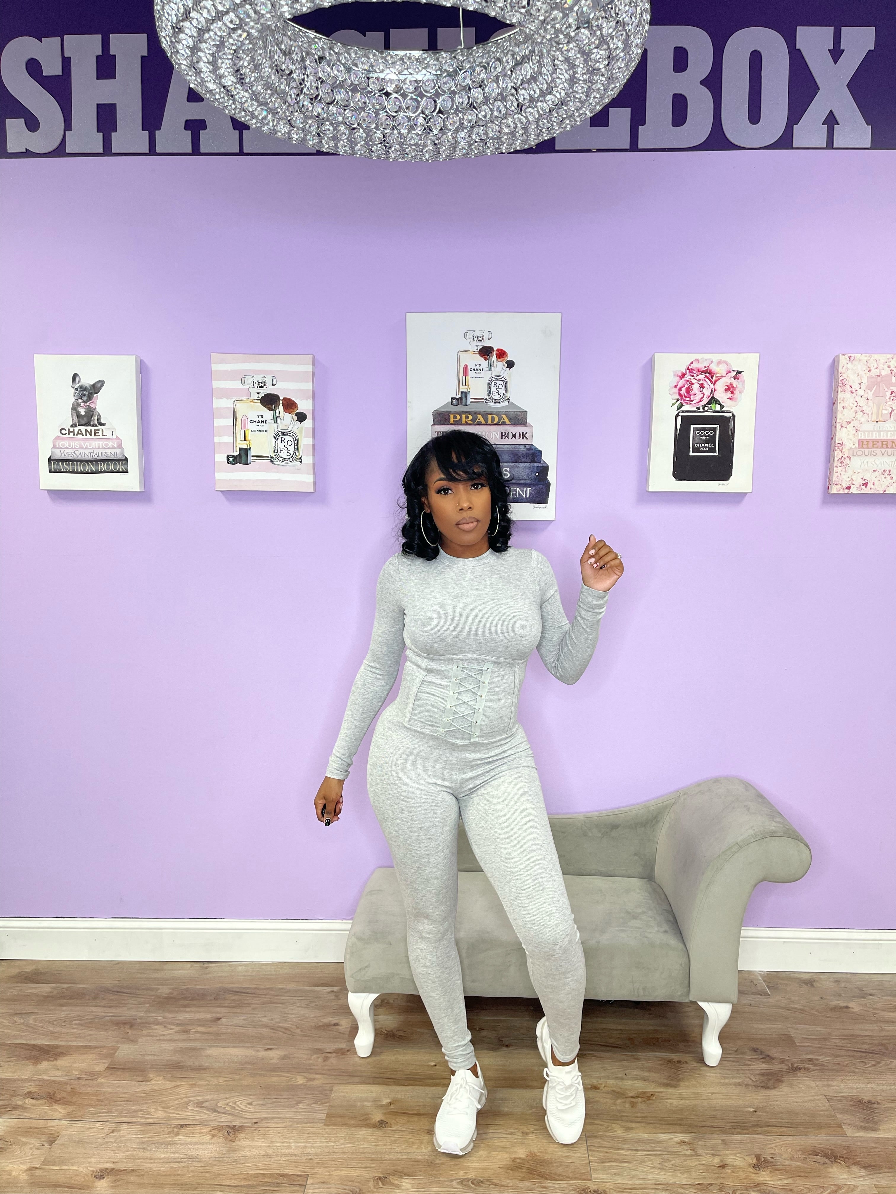 Solid jumpsuit with corset detail Very Stretchy material  true to size  Shae is wearing a size small