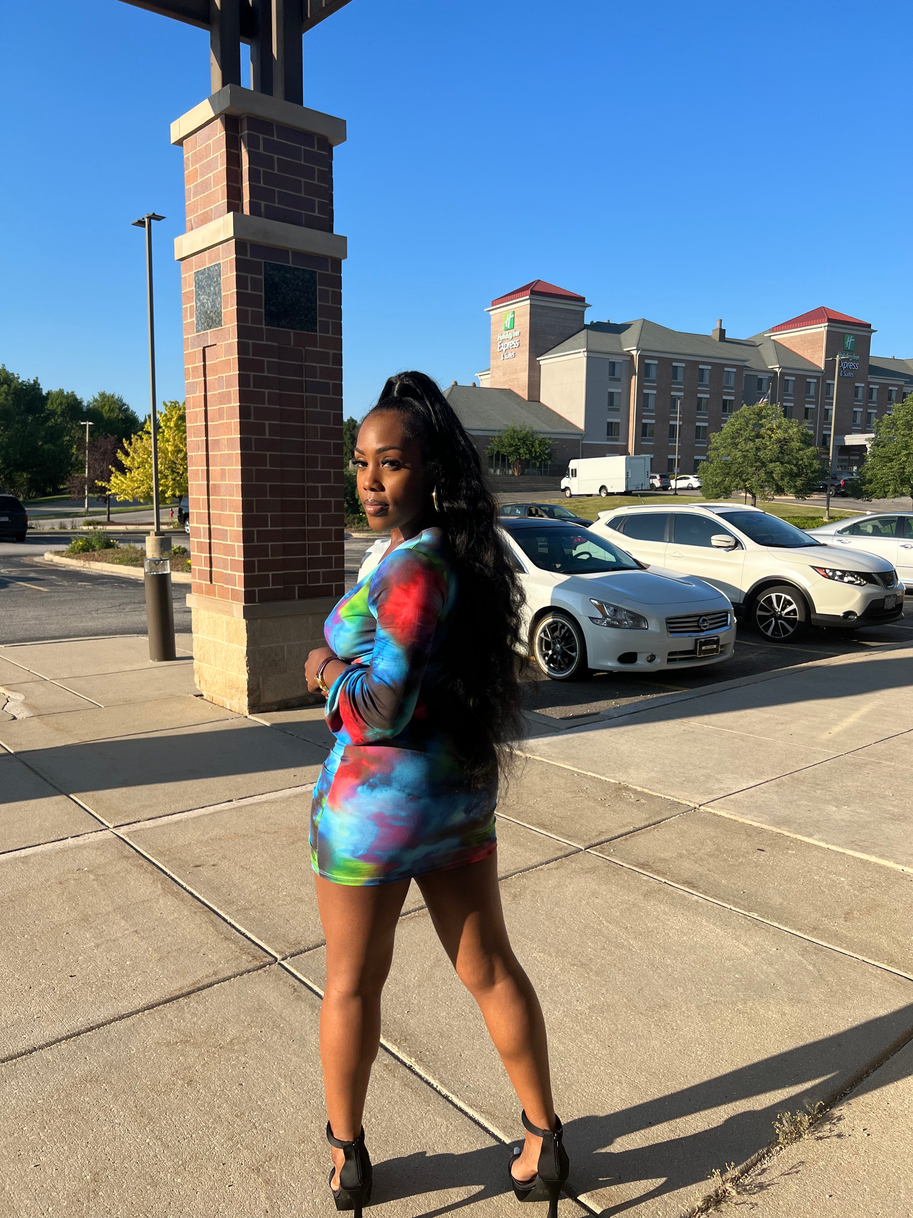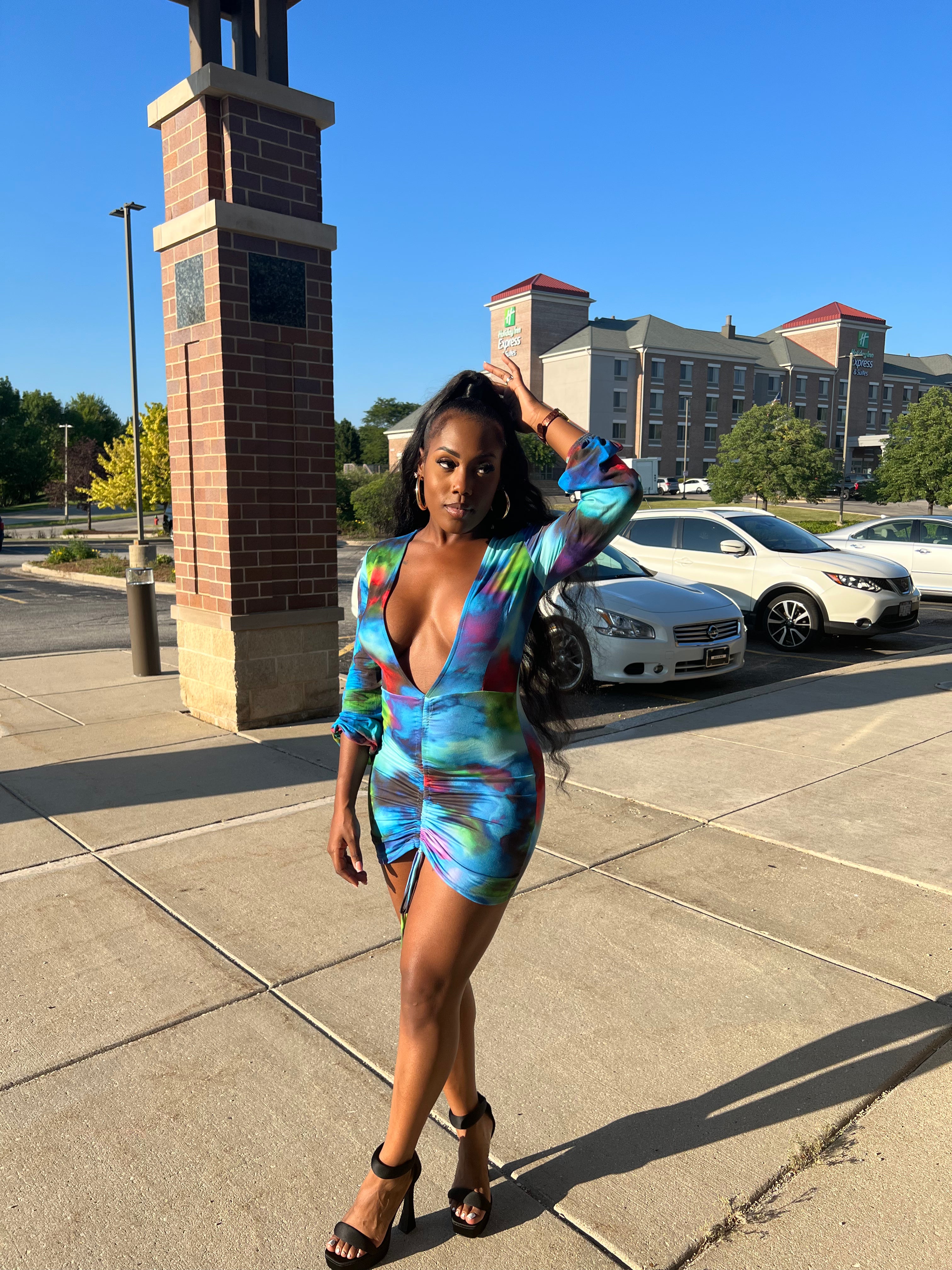 Deep V Neck ruched front long sleeve dress true to size Model is wearing a size small