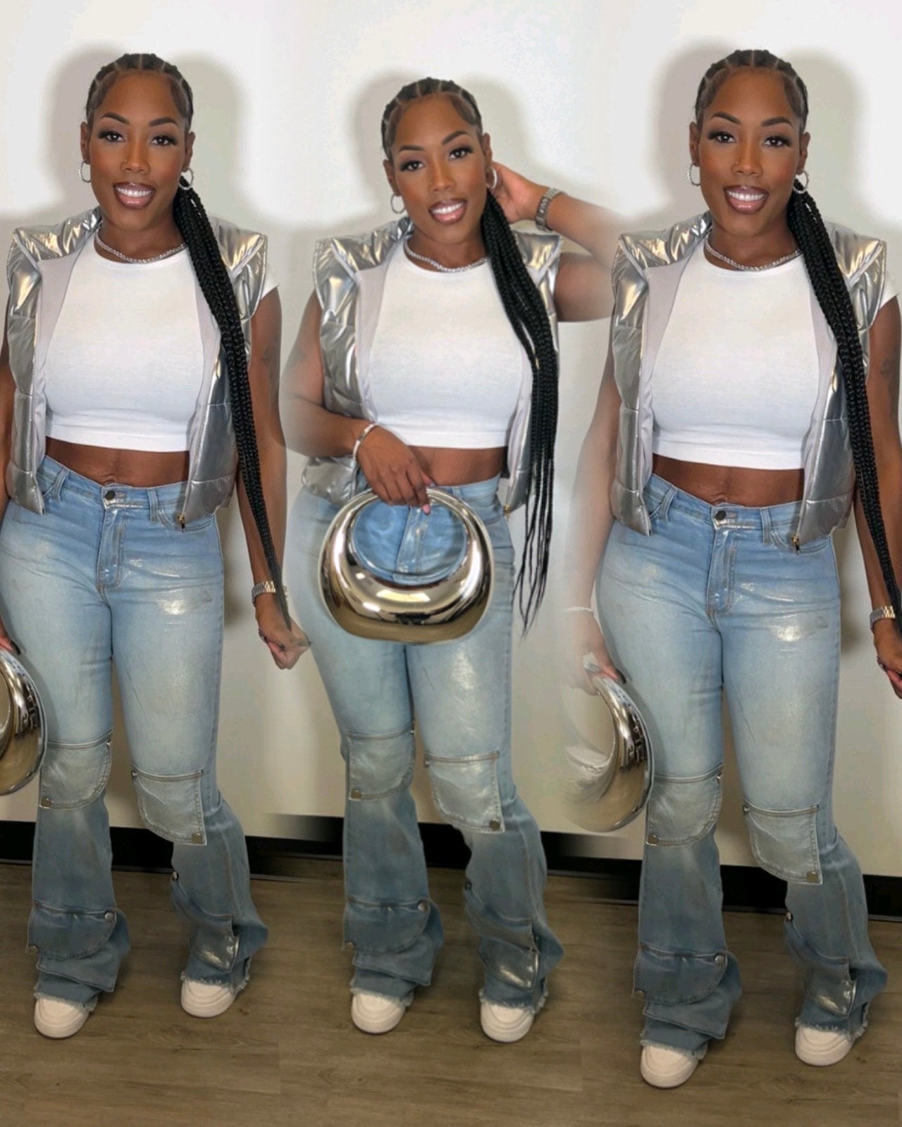These mid-rise denim jeans are adorned with metallic silver foil all over, and include cargo-style pockets on each...