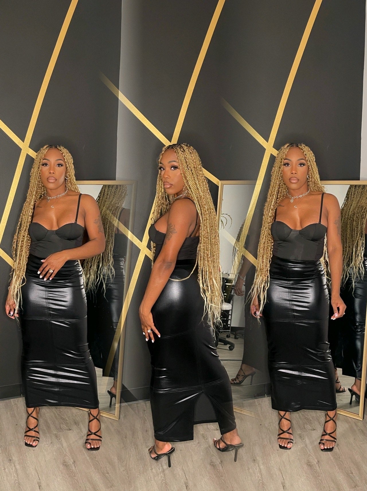 Metallic shiny high waist long skirt with back slit stretchy and fits true to size model is...